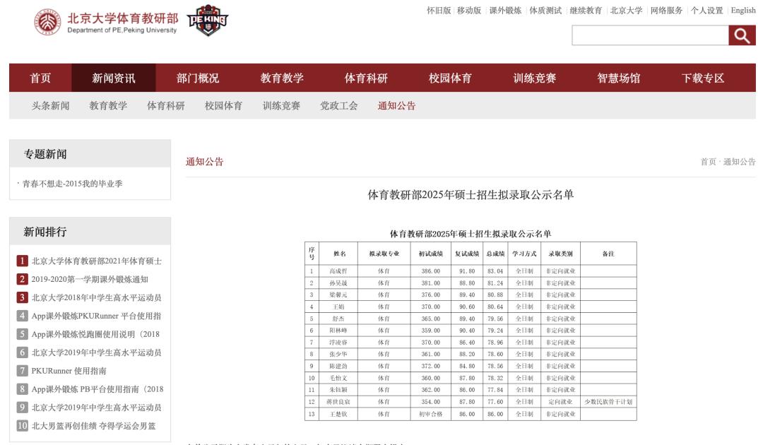 4月2日,北京大学体育教研部公布2025年硕士招生拟录取公示名单。