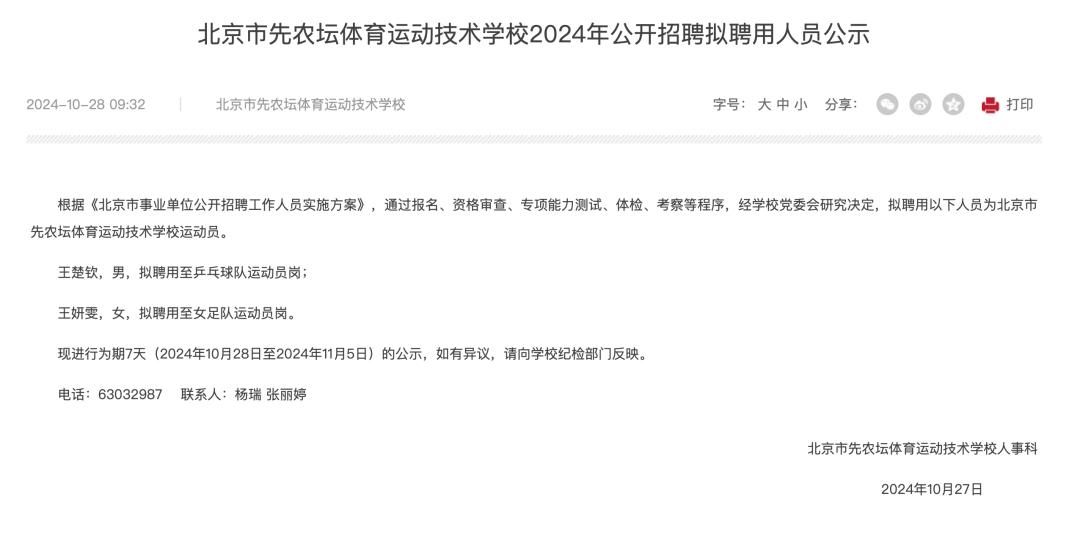 2024年10月28日,北京市体育局官网发布《北京市先农坛体育运动技术学校2024年公开招聘拟聘用人员公示》。其中,王楚钦被拟聘用至北京市先农坛体育运动技术学校乒乓球队运动员岗。