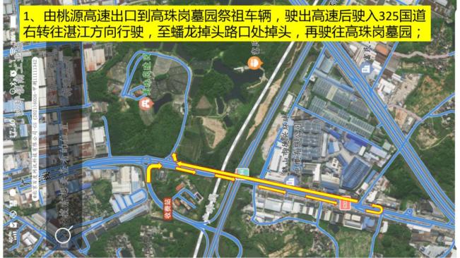 1、由桃源高速出口到高珠岗墓园祭祖车辆,驶出高速后驶入325国道右转往湛江方向行驶,至蟠龙掉头路口处掉头,再驶往高珠岗墓园;