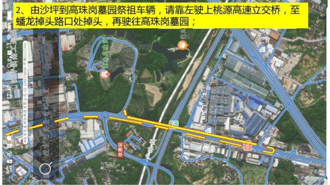 2、由沙坪到高珠岗墓园祭祖车辆,请靠左驶上桃源高速立交桥,至蟠龙掉头路口处掉头,再驶往高珠岗墓园;