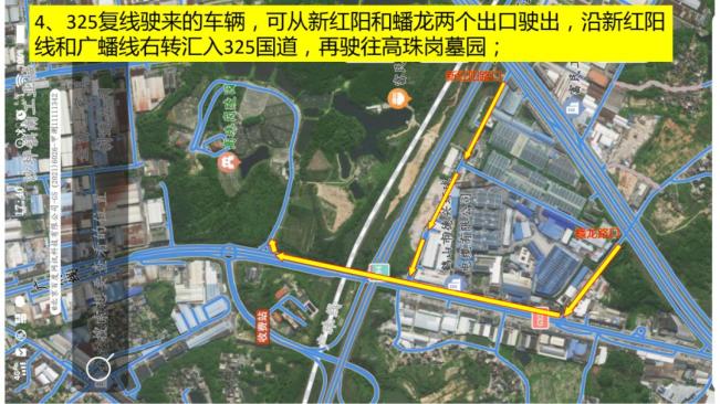 4、325复线驶来的车辆,可从新红阳和蟠龙两个出口驶出,沿新红阳线和广蟠线右转汇入325国道,再驶往高珠岗墓园;