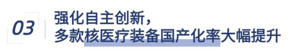 核医疗装备是癌症、肿瘤等疾病早期筛查、诊断及治疗所不可或缺的重要基础。中核集团加速推进核医疗装备国产化布局,围绕分子影像装备、放射治疗装备开展系列项目科技攻关和产品自主研发,着力提升高端核医疗装备国产化率,保障医疗体系稳定运行,确保医疗资源自主可控。2024年,中核集团自主研发的硼中子俘获(BNCT)治疗装备“鲲鹏刀”国产化率达到90%,成为国内BNCT厂商里唯一取得两个订单的企业,“鲲硼刀”对于复发性、浸润性、局部转移肿瘤具有突出临床优势,多项技术填补国内空白。自主研发的VeloX直线加速器,功能性能国际领先,组件级实现100%国产化,零件级实现85%国产,将在图像清晰度、治疗质量、治疗效率和成本等方面带来突破性改变。自主研发的新一代伽玛射束立体定向放射治疗系统实现获批上市,已预售9台,整机物料国产化率超过95%,可提供完全自主的“源械”协同模式方案。全球首台螺旋断层(Tomo C)放射治疗设备获批上市,2024全年实现销售24台,Tomo C系全球首次形成了螺旋双源CT影像系统和螺旋断层放疗系统“同轴共环”的理想结构,实现了诊断影像和精准治疗相融合的全新诊疗模式,为临床带来无限可能。面向未来,中核集团将持续深耕核医疗装备产业,顺应诊疗一体化、移动化趋势,加速核心部件攻关,按照“放疗+影像”的一体化发展方向,形成核医疗装备全谱系布局,推动核医疗装备向精准化、智能化方向发展。