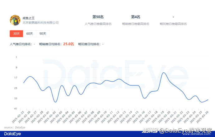 因为这样的情况在曾经的小游戏王者产品《咸鱼之王》身上也出现过。即使《咸鱼之王》难回巅峰,却可以一直活跃在畅销榜。数据显示,《咸鱼之王》近30天依然稳定在畅销榜TOP40内,近90天最高排名一度冲上第4名。