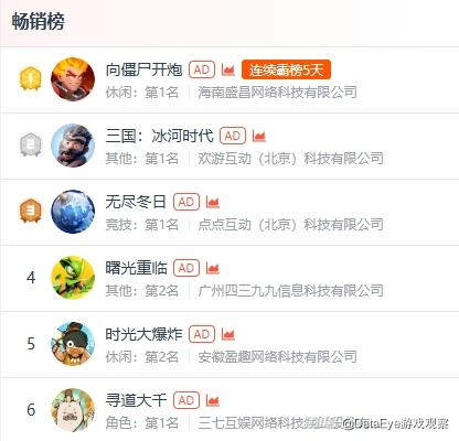 这就意味着两款3月上线的新产品用了极短的时间就冲到畅销榜前列,也让微信小游戏头部阵营发生巨变。截至3月28日,微信小游戏畅销榜TOP5分别是,《向僵尸开炮》《三国:冰河时代》《无尽冬日》以及《曙光重临》和《时光大爆炸》。