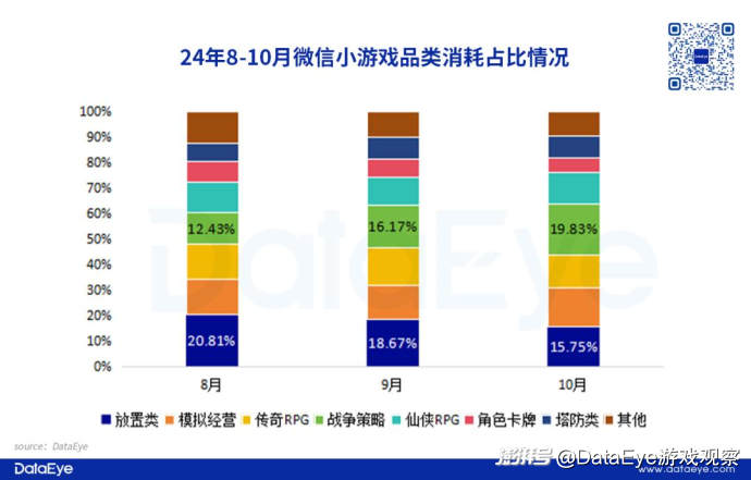 10月之后战争策略品类消耗占比基本维持在20%左右,而放置(含开箱)品类进一步下滑。以最新消耗占比数据显示,战争策略消耗占比超过21%,而放置(含开箱)品类占比下滑至14%。