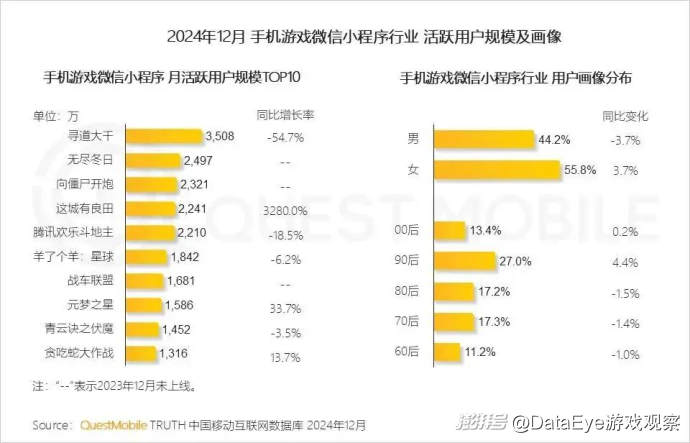 同时随着《寻道大千》跌出微信小游戏畅销榜TOP5,也就意味着目前小游戏TOP5阵营里面,已无2024年前上线的小游戏产品了。