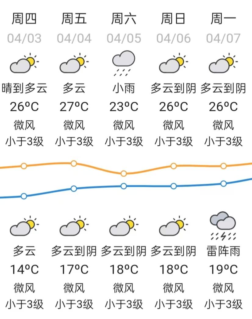 4月3-4日,晴间多云,气温继续回升,昼夜温差加大;4月5-6日,受弱冷空气和切变线影响,多云到阴天,有阵雨,气温小幅波动。