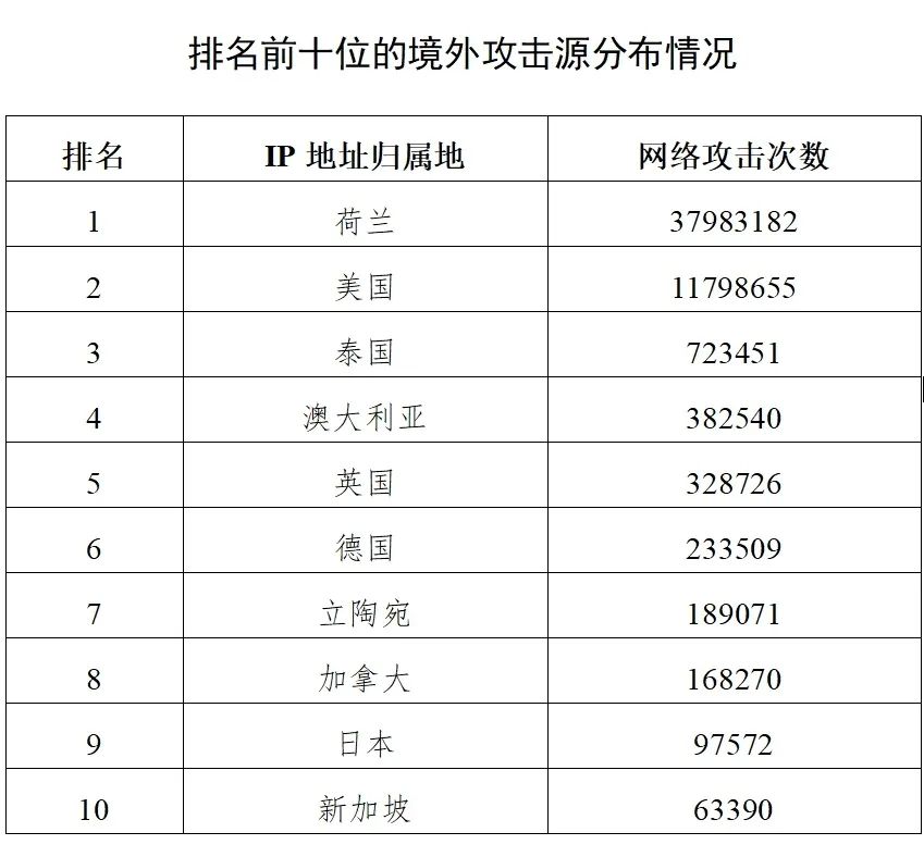 1月31日至2月14日期间,针对黑龙江省内关键信息基础设施实施的网络攻击主要源自美国及其盟友国家,其中攻击次数最多的三个国家分别为荷兰(3798万次)、美国(1179万次)、泰国(72万次)。澳大利亚、英国、德国、立陶宛、加拿大、日本和新加坡分别位列第四至第十位。