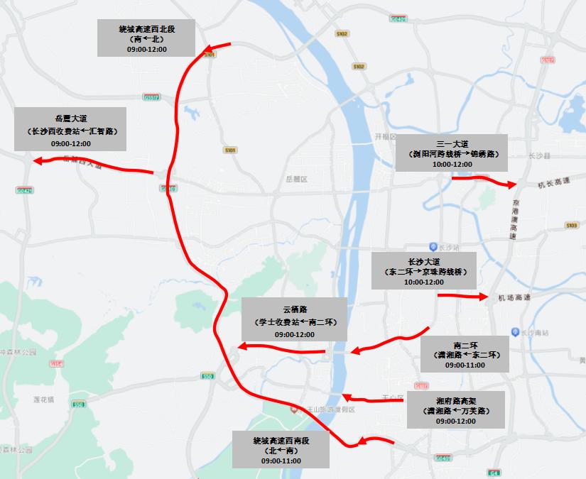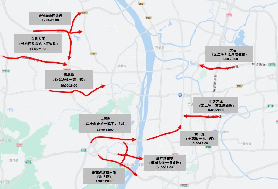 预测节前出城车流主要集中在15-19时。15时起湘府路高架、长沙大道、云栖路和三一大道等道路出城方向车流逐步上升;17-19时出城车辆达到峰值;22时所有进出城道路交通基本恢复正常。节中进出城通道流量示意图