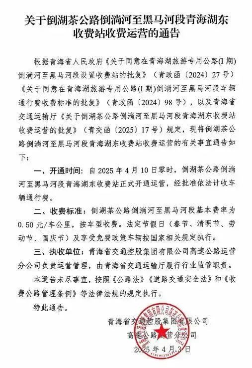 一、开通时间:自2025年4月10日零时,倒湖茶公路倒淌河至黑马河段青海湖东收费站正式开通运营,经批准依法计收车辆通行费。