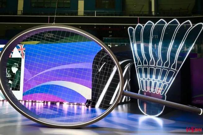 ▲汤尤杯赛场设置的羽毛球拍和羽毛球装置成都羽毛球热进全国前五