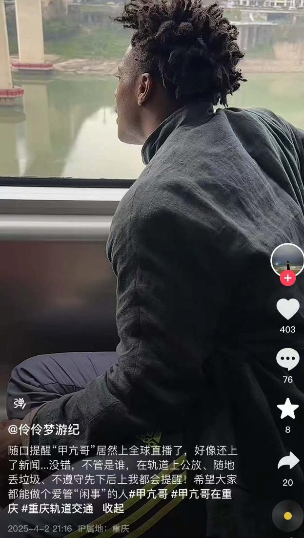 据媒体报道,4月2日,“甲亢哥”体验坐轻轨,到站时他激动地在车厢和站台之间跳来跳去。
