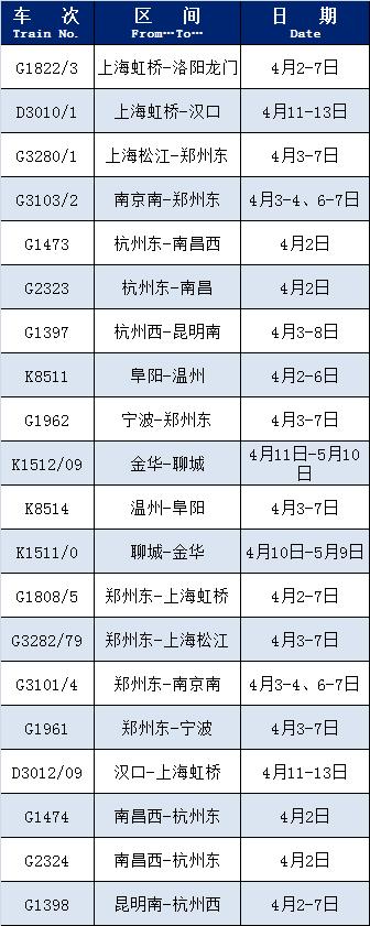 部分列车恢复开行,涵盖了长三角地区开往华中、华南、华东等方向的线路,包括上海、南京、杭州、郑州、南昌等多地间车次,如上海虹桥-洛阳龙门(G1822/3次)、昆明南-杭州西(G1398次)等,运行日期大多集中在4月2-7日,满足旅客在清明假期探亲、旅游、商务等出行需求。