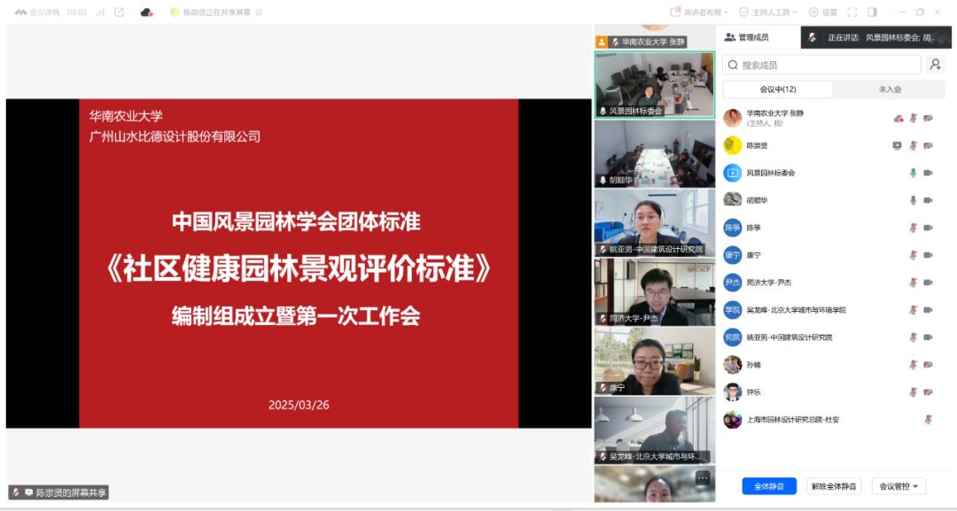 3月26日,中国风景园林学会团体标准《社区健康园林景观评价标准》(以下简称《标准》)编制组成立暨第一次工作会议,以线上线下结合的方式在广州顺利召开。