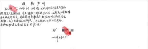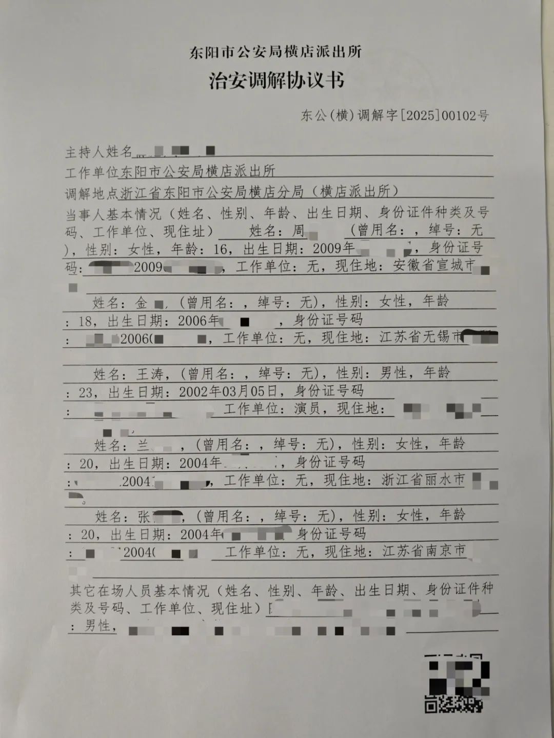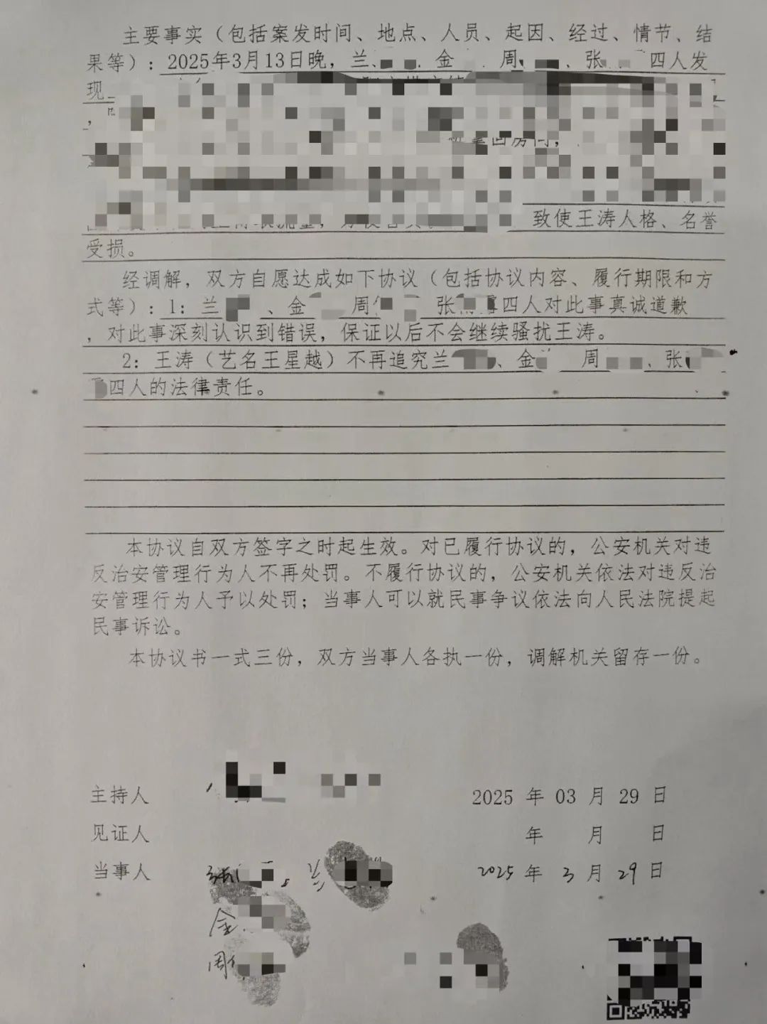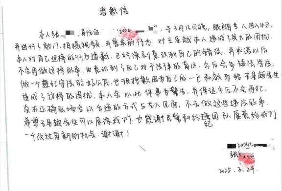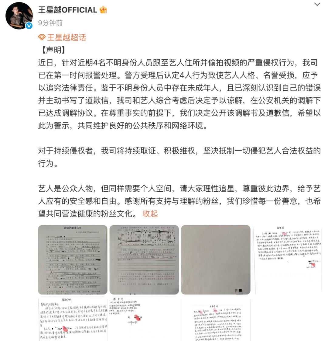 近日,针对近期4名不明身份人员跟至艺人住所并偷拍视频的严重侵权行为,我司已在第一时间报警处理。警方受理后认定4人行为致使艺人人格、名誉受损,应予以追究法律责任。鉴于不明身份人员中存在未成年人,且已深刻认识到自己的错误并主动书写了道歉信,我司和艺人综合考虑后决定予以谅解,在公安机关的调解下已达成调解协议。在尊重事实的前提下,我们决定公开该调解书及道歉信,希望以此为警示,共同维护良好的公共秩序和网络环境。对于持续侵权者,我司将持续取证、积极维权,坚决抵制一切侵犯艺人合法权益的行为。