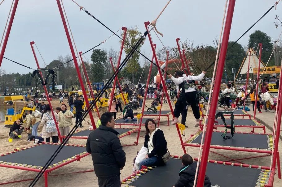 亲子消费场景是鲁家滩春日经济的重要组成部分。嘣叭乐园是一个以“轻体育、微度假”为特点的沉浸式体验乐园,攀爬、木梯、天际穿越、桶箍等充满趣味的体验项目吸引着不少亲子家庭。