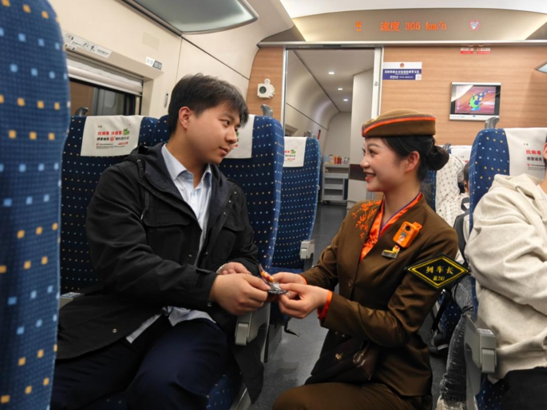 “原以为买不到今天回家的车票了,没想到铁路部门临时加开了‘夜行高铁’,解决了我们回家乡探亲的难题,为你们点赞!”带着全家人从武汉回随州老家的晏先生微笑着对正在查验车票的列车长王晶说道。