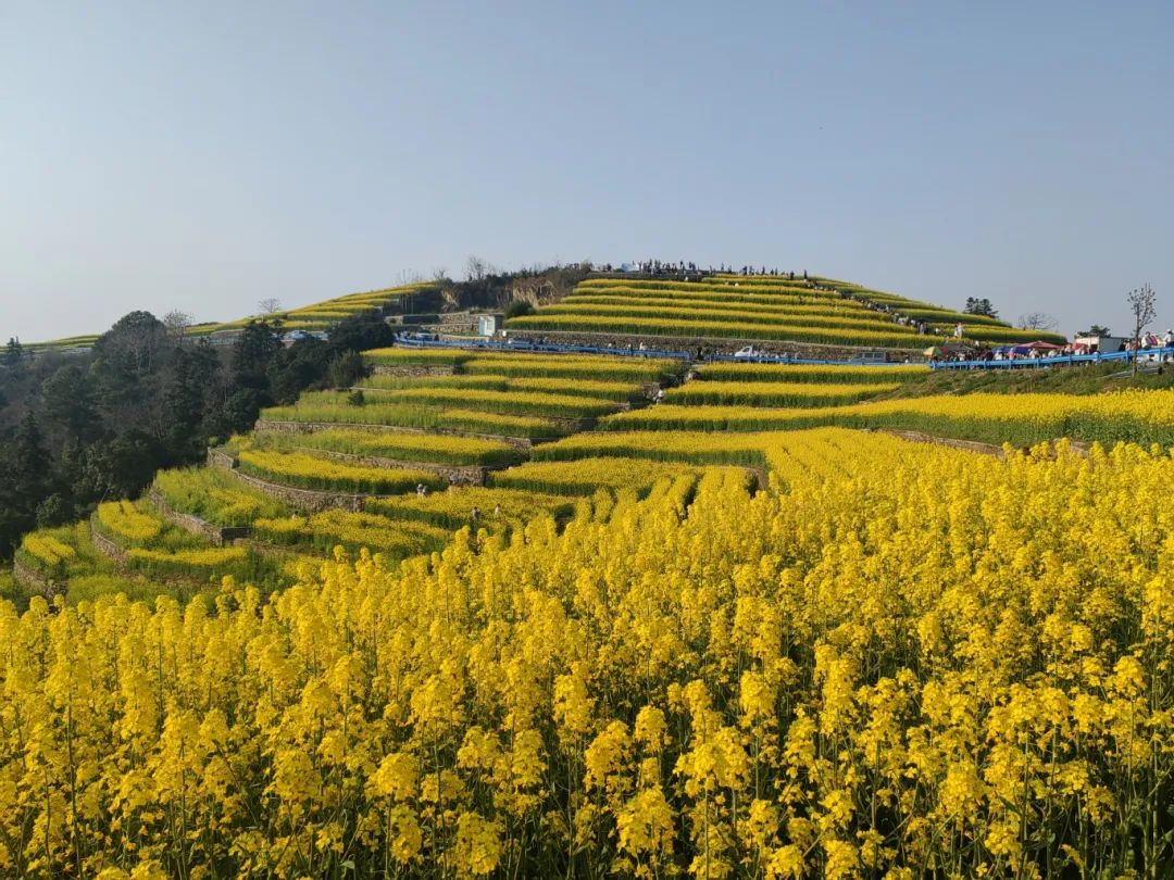 攀上山里王村油菜花梯田的观景平台,满山坡的油菜花黄灿灿的在汩汩流动,挽着春风,一层一层的,叠瀑般从山顶流泻而下,待要触底时,拨转头又从山腰处顶涌上来,一圈又一圈拍在几片起伏的山坡上,这回可是跑不动了,定格成一条条金色围脖。色彩在山坳里传送着五彩斑斓的声声回响。