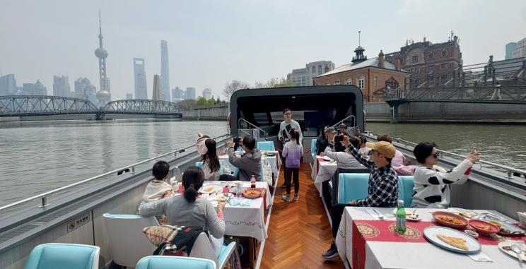 清明假期,苏州河游船午餐航班正式在昌化路码头首航,吸引了众多市民和游客前来体验。这次的航班是在去年12月苏州河游船推出餐饮主题航班以来的2.0版本。