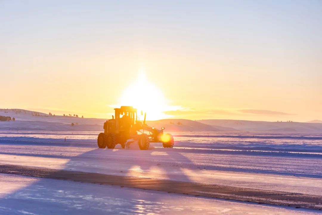 ©平地机在晨曦中进行扫雪作业。