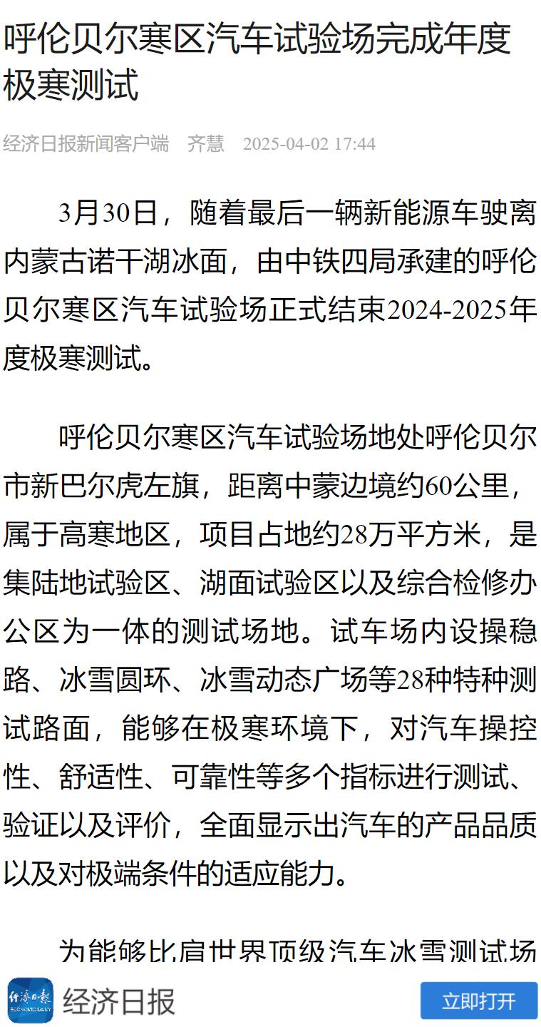 ©《经济日报》客户端:呼伦贝尔寒区汽车试验场完成年度极寒测试