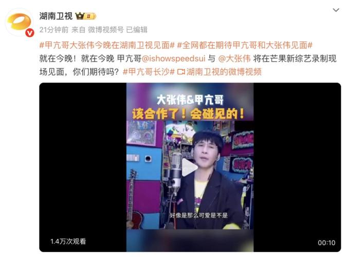 刚刚,湖南卫视微博发文称:就在今晚!“甲亢哥”与大张伟将在芒果新综艺录制现场见面,你们期待吗?