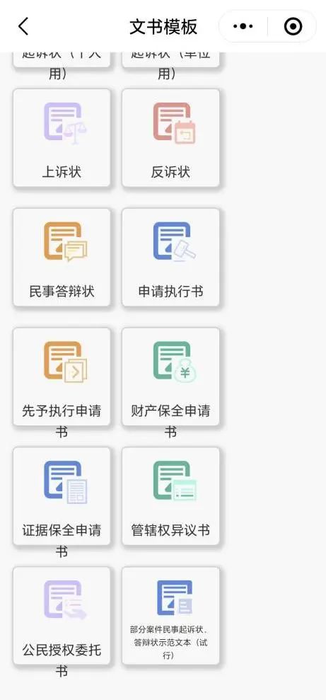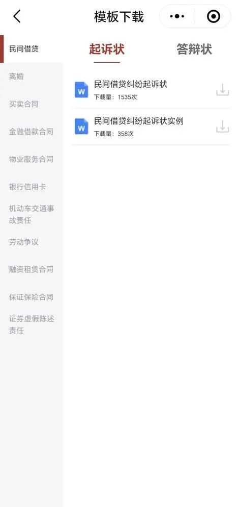 方式1:微信小程序“人民法院在线服务”(初次登录需注册、验证身份)→下划选择【辅助工具】→点击【文书模板】→点击【部分案件民事起诉状、答辩状示范文本(试行)】,选择所需文本下载使用。