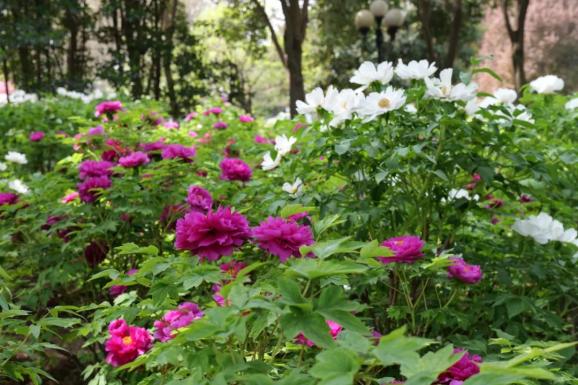 中国国花园国家牡丹园:全园共有约180个品种牡丹开放,主要分布在南园牡丹展览馆、南园精品园、凤丹林、北园九色台。其中:盛开的牡丹品种有荷花绿、宏图、藏枝红、凤丹、冰罩蓝玉、美艳、太平红、北洋粉、黑海撒金、冰壶献玉、卷叶红、黑豹、蓝月亮、洛阳红、春柳等;初开的牡丹品种有赵粉、白雪塔、春柳、迎日红、泼墨、彩绘、朱砂垒等。园内荷包牡丹、碧桃、紫荆、连翘等竞相绽放。