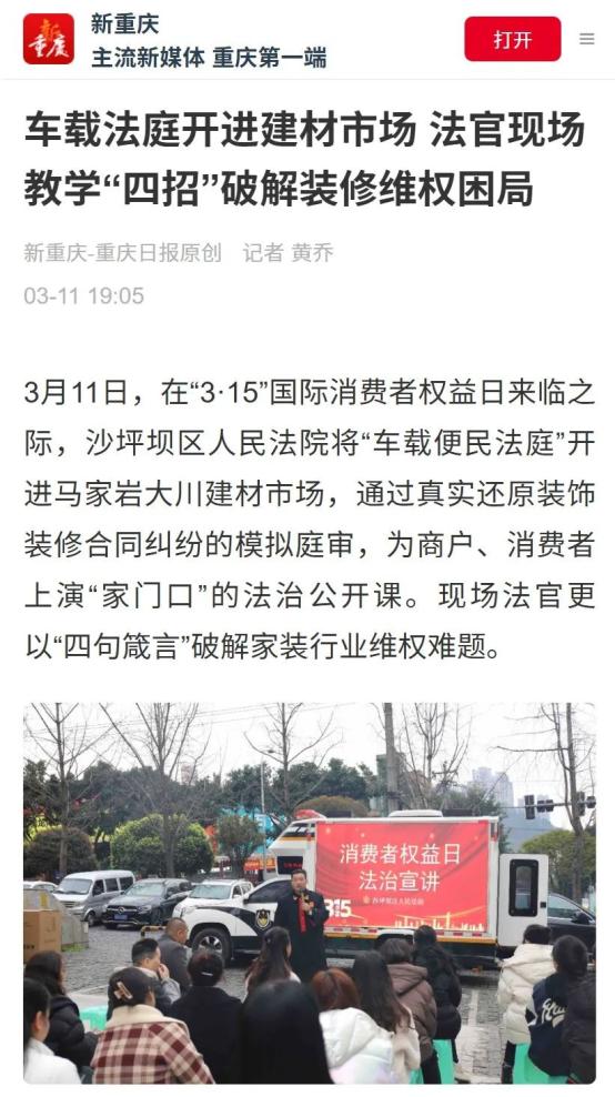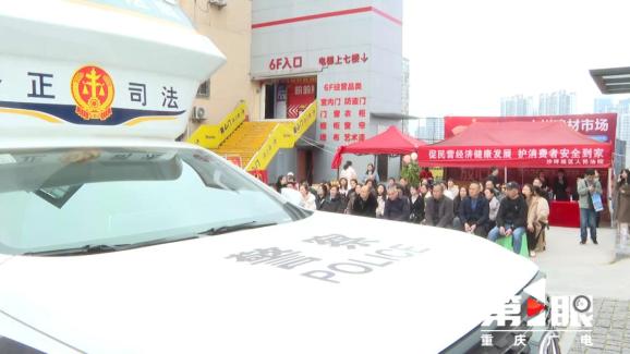 “3·15”国际消费者权益日到来前夕,沙坪坝区法院的法官走进马家岩大川建材市场,利用车载便民法庭开展法治宣传,并结合一起装饰装修合同纠纷案件,向商家和消费者释法明理,普及法律知识。