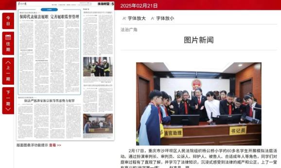 2月17日,重庆市沙坪坝区人民法院组织杨公桥小学的60多名学生开展模拟法庭活动。通过扮演审判长、审判员、公诉人、辩护人、被告人、合适成年人等角色,同学们对庭审过程有了直观了解,并学习了法律知识,沉浸式感受到法律的威严和公正,上了一堂有意义的“开学第一课”。