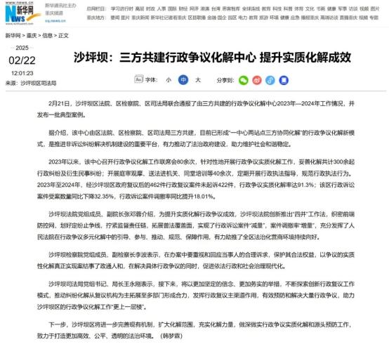 《沙坪坝:三方共建行政争议化解中心 提升实质化解成效》
