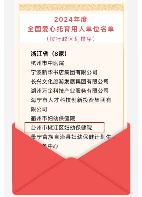 原标题:《儿童友好·和合台州|椒江区妇幼保健院获评2024年度全国爱心托育用人单位》
