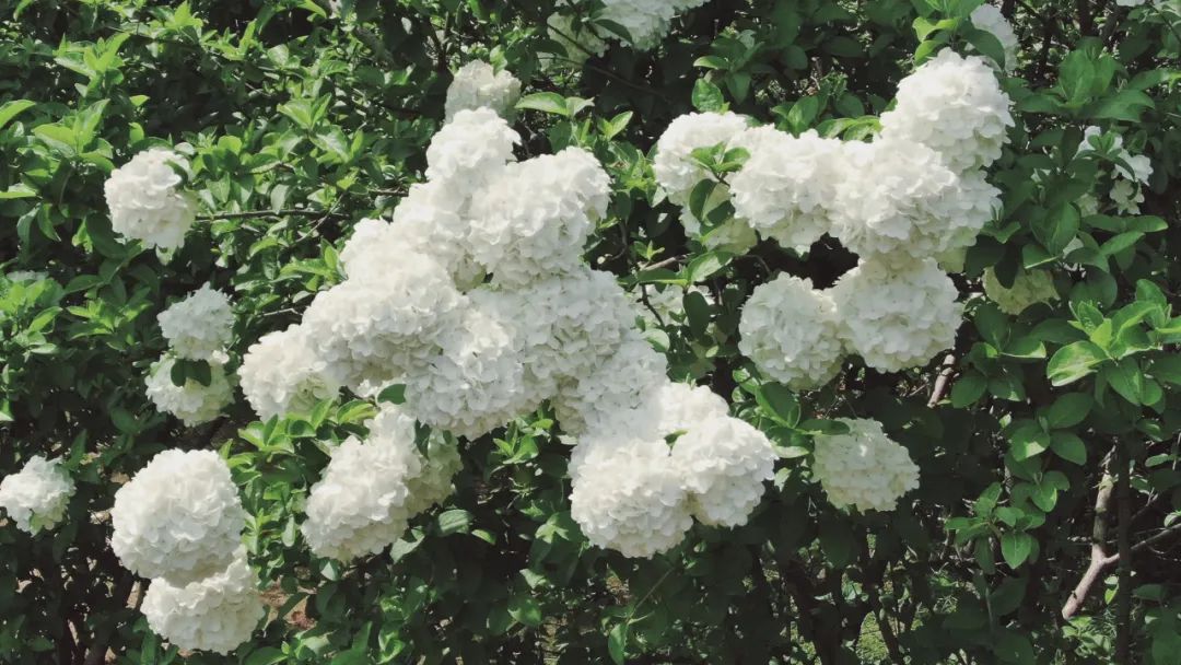 前往径山的道路两旁,种着不少的木绣球。正在盛花期的木绣球,白色花朵团团簇簇缀满枝头。雪白的绣球花在微风中摇曳,每一朵都圆润饱满,花瓣层层叠叠,在阳光下泛着柔和的光泽。
