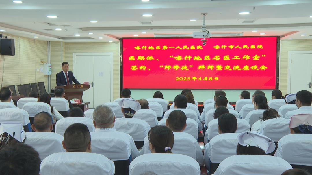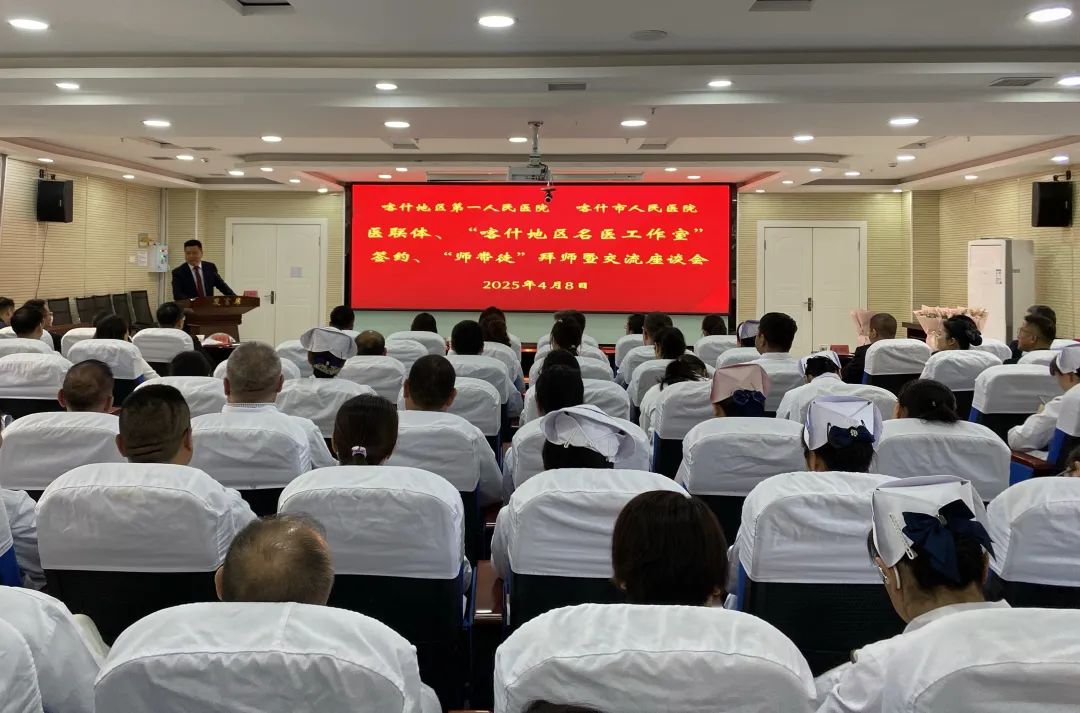 4月8日,喀什地区第一人民医院与喀什市人民医院医疗联合体续签约、“喀什地区名医工作室”签约、“师带徒”拜师暨交流座谈会在市人民医院东城院区举行。