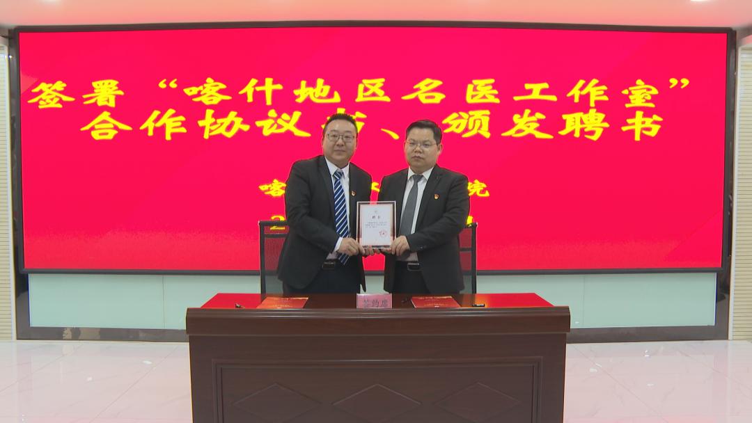 活动中,喀什地区第一人民医院名医与喀什市人民医院签署“喀什地区名医工作室”合作协议书。喀什市人民医院向名医们颁发聘书,正式聘请他们为医院技术指导专家。