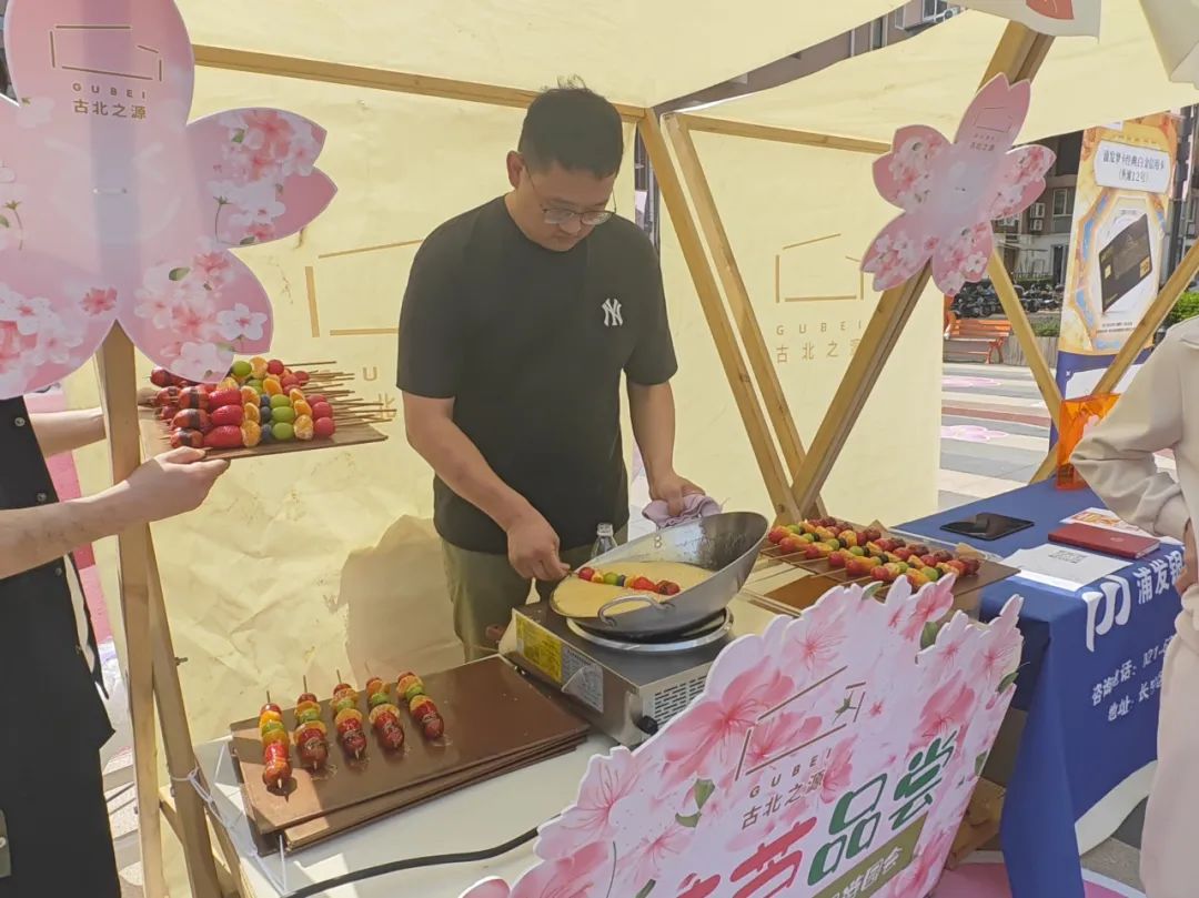 春日的阳光洒落古北万科广场,当天下午两点,各色街区商铺“出摊”了。在赏樱打卡区,不少居民兴奋地在粉白交织的樱花主题拍照框前留下春日影像。广场中央的公益实践区内,周边街区商铺带来的体验项目各具特色,瑜伽老师带领大家舒展身心;肩颈按摩服务让人直呼“解压”;还有古风服装体验、可回收物换绿植等趣味互动。而在集市互动区,漆画、糖葫芦、咖啡、糕点、樱花书签等活动精彩不断。糖葫芦摊位更是人气爆棚。糖浆在锅中“咕噜”冒泡,只见摊主利落地将五彩缤纷的水果糖葫芦串裹上糖浆,轻轻一甩,糖丝如金线飘落,引来无数“馋客”。
