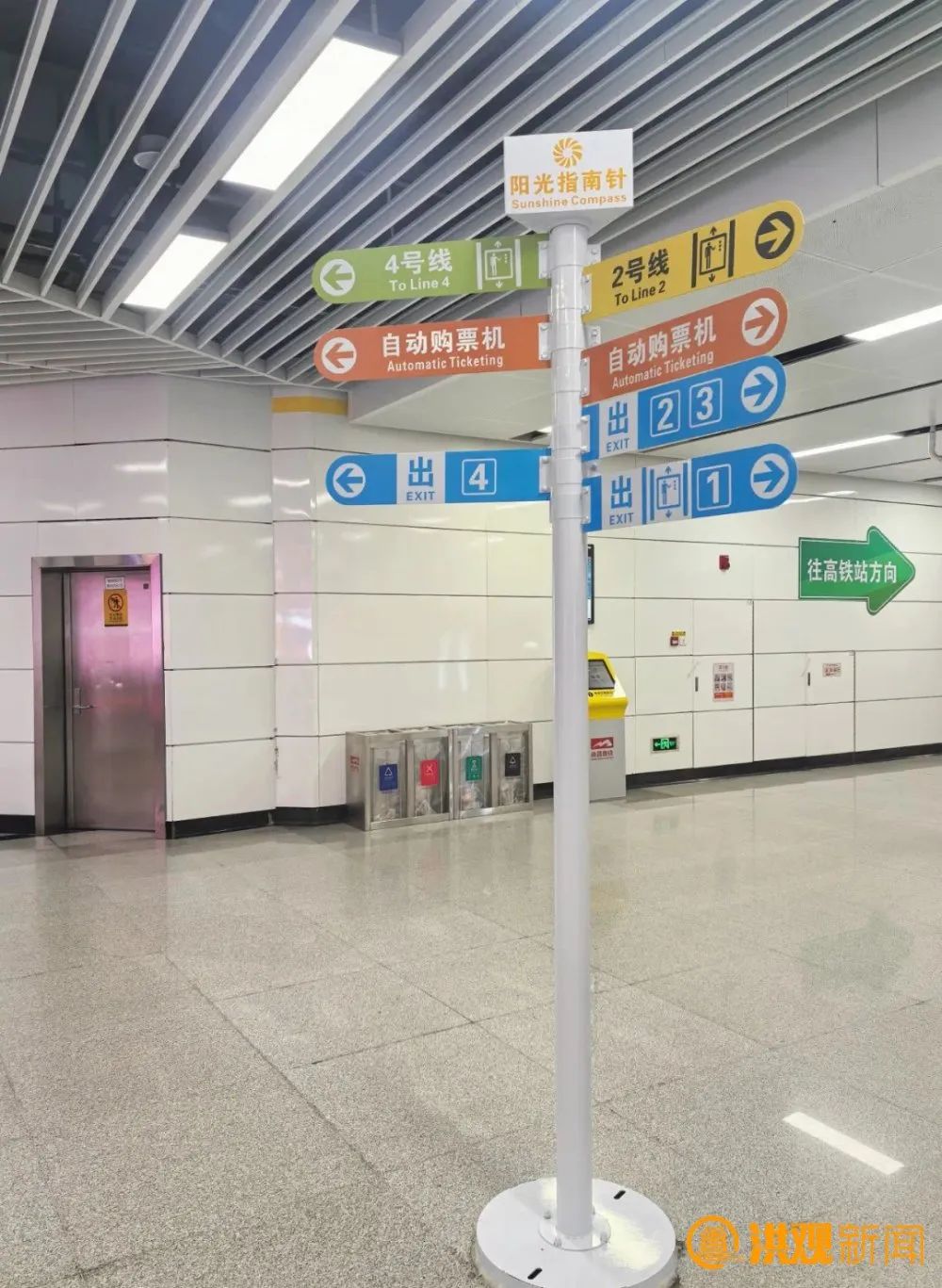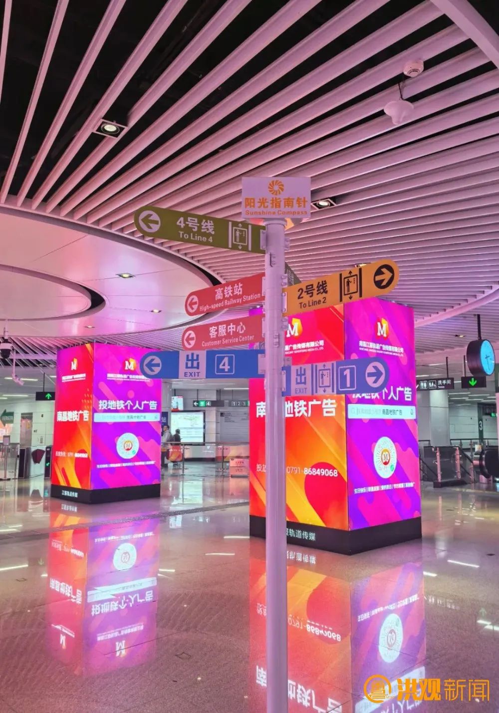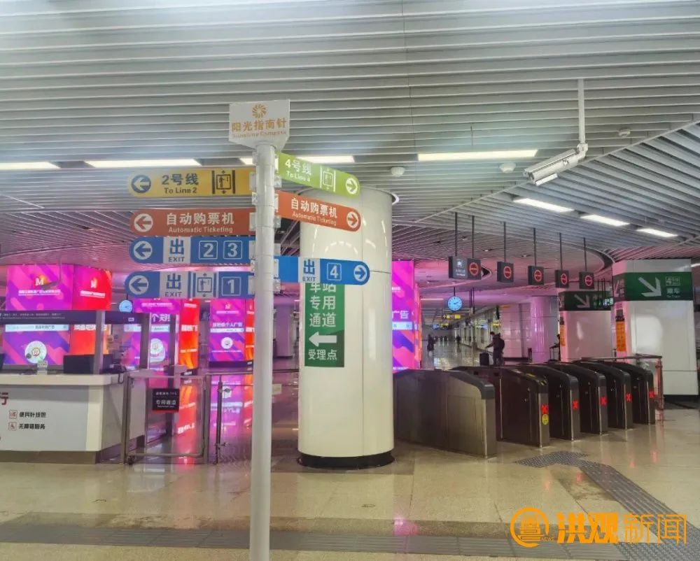 为解决这一难题,南昌地铁在该车站新增“阳光指南针”多方位指示立柱。这些立柱采用醒目的色彩,对2号线、4号线的乘车方向、高铁换乘通道以及出入口方向进行了清晰区分,且立柱上设置的多个指示牌,全方位展示了不同线路、不同方向的乘车信息和出入口位置。
