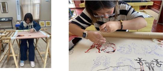 社会担当:赋能女性与文化传播“让年轻人爱上楚绣,让楚绣走向世界。” 李辰婷将技艺传承的目光投向教育领域。她在荆州开发区第一小学、岑农中学开设楚绣公益课堂,通过“纹样认知——基础针法——创意设计”三阶教学模式,培养青少年对手工刺绣的兴趣。截至目前,已累计开展课程百余场,覆盖学生超2000人次。