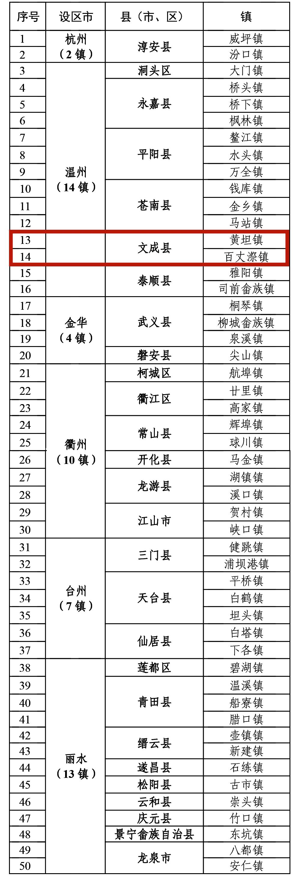 日前,经省委省政府同意,省发展改革委公布《新一轮首批(山区海岛县)省级中心镇名单》。文成县黄坦镇、百丈漈镇成功入选。