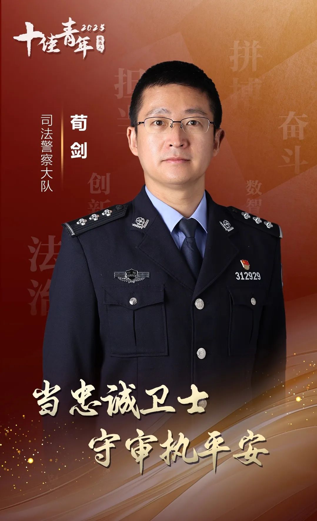 荀剑,1985年10月出生,现任上海市普陀区人民法院司法警察大队二级警长。