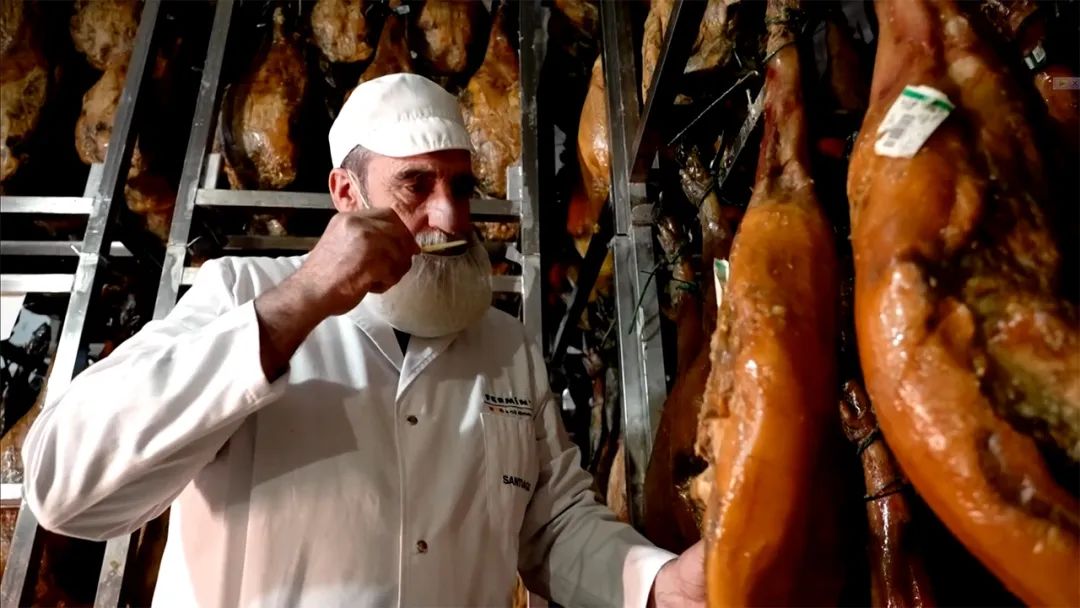 西班牙火腿制造商正在检查火腿质量。 视频截图