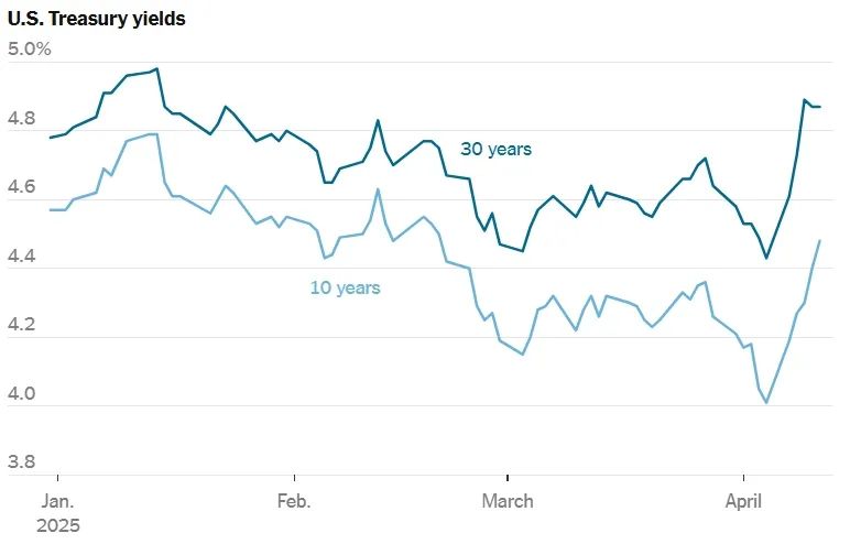 路透社报道称,本周中方祭出多轮反制措施,加之美国政策反复无常、朝令夕改,外界对美国资产的信心被极大动摇。最能体现美国资产抛售情况的美国10年期国债价格下跌,推动其收益率升至两个月高点,创下自2001年以来的最大单周涨幅,一周飙升0.5%。30年期美债收益率的上升也创下了历史新高。