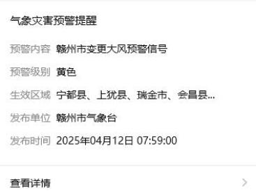 赣州市气象台2025年04月12日07时59分变更大风黄色预警信号:预计未来6小时内,赣州市章贡区、经开区、蓉江新区、赣县区、南康区、宁都县、上犹县、瑞金市、会昌县、兴国县、于都县、大余县、信丰县、石城县、崇义县、安远县、全南县的部分地区将出现8-9级雷暴大风,局地伴有强雷电、短时强降水等强对流天气,请注意防范。