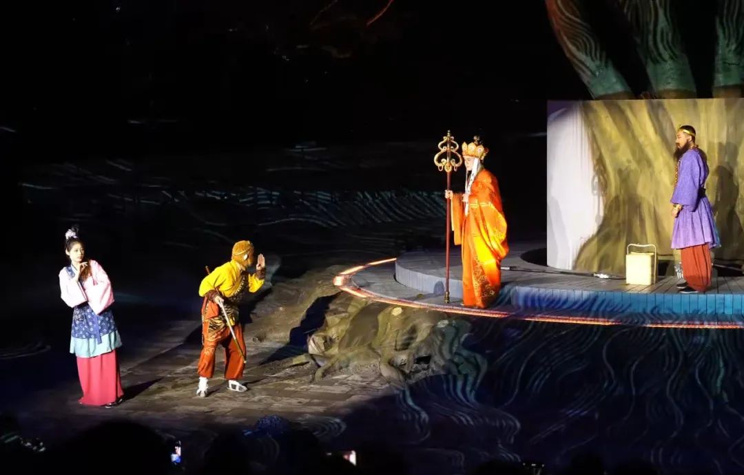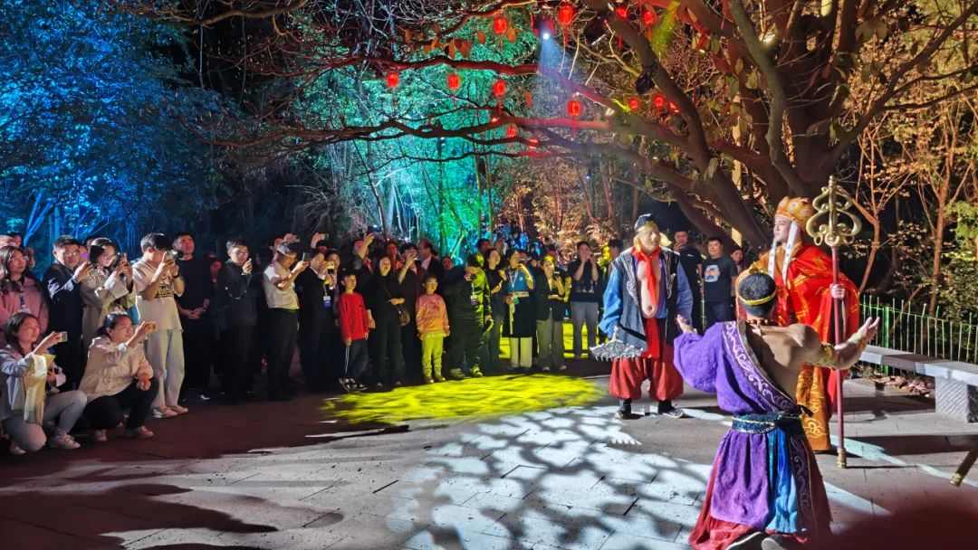 在陡坡塘景区,嘉宾们手持互动设备,在光影交织中“偶遇”神话角色,体验了一场跨越时空的西游奇遇。陡坡塘夜游项目依托《西游记》主题文化,以科技光影和生动演绎,通过3D裸眼全息影像、AI建模以及智能交互等形式,打破传统观演模式,以山水为幕,以光为笔,在数字光影中致敬西游经典。