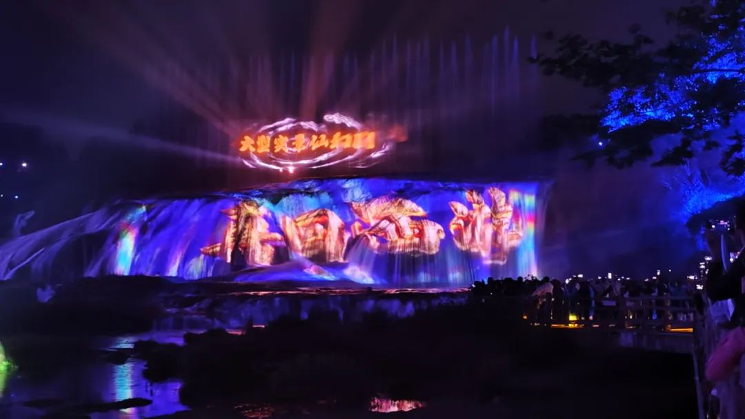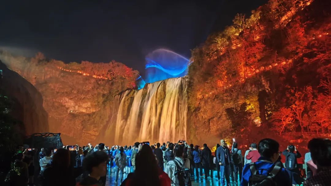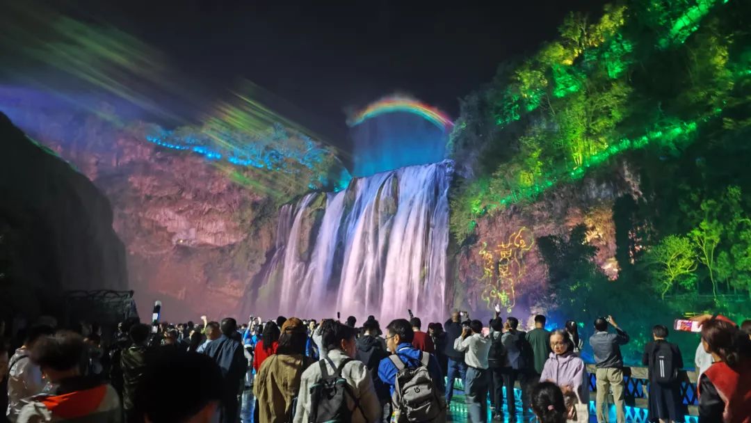 随后,与会嘉宾们一行来到夜游黄果树。黄果树大瀑布在灯光映衬下宛如银河倾泻,水雾间折射出梦幻般的色彩。嘉宾们沿着步道漫步,沉浸于声光电技术打造的“山水夜画”中——丛林间的光影互动、水幕投影的贵州民族故事、溶洞内的沉浸式剧场,让夜晚的黄果树焕发出不同于白昼的奇幻魅力。
