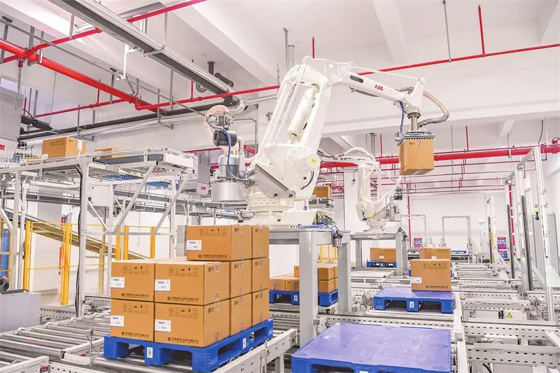 在海口药谷工业园齐鲁制药综合智能高架立体仓库,机械臂在搬运货品。海口市融媒体中心记者 孙士杰 摄
