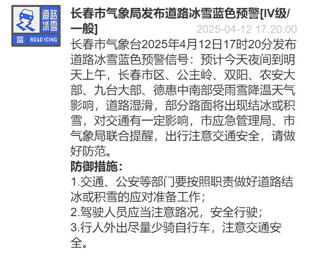 预计12日夜间到13日上午,长春市区、公主岭、双阳、农安大部、九台大部、德惠中南部受雨雪降温天气影响,道路湿滑,部分路面将出现结冰或积雪,对交通有一定影响,市应急管理局、市气象局联合提醒,出行注意交通安全,请做好防范。