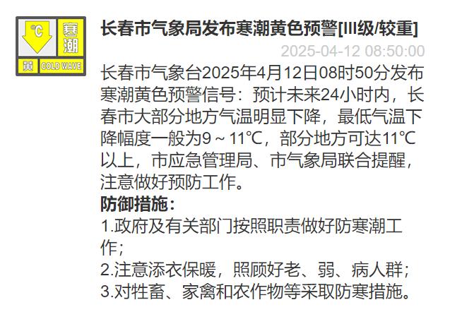 预计未来24小时内,长春市大部分地方气温明显下降,最低气温下降幅度一般为9~11℃,部分地方可达11℃以上,市应急管理局、市气象局联合提醒,注意做好预防工作。