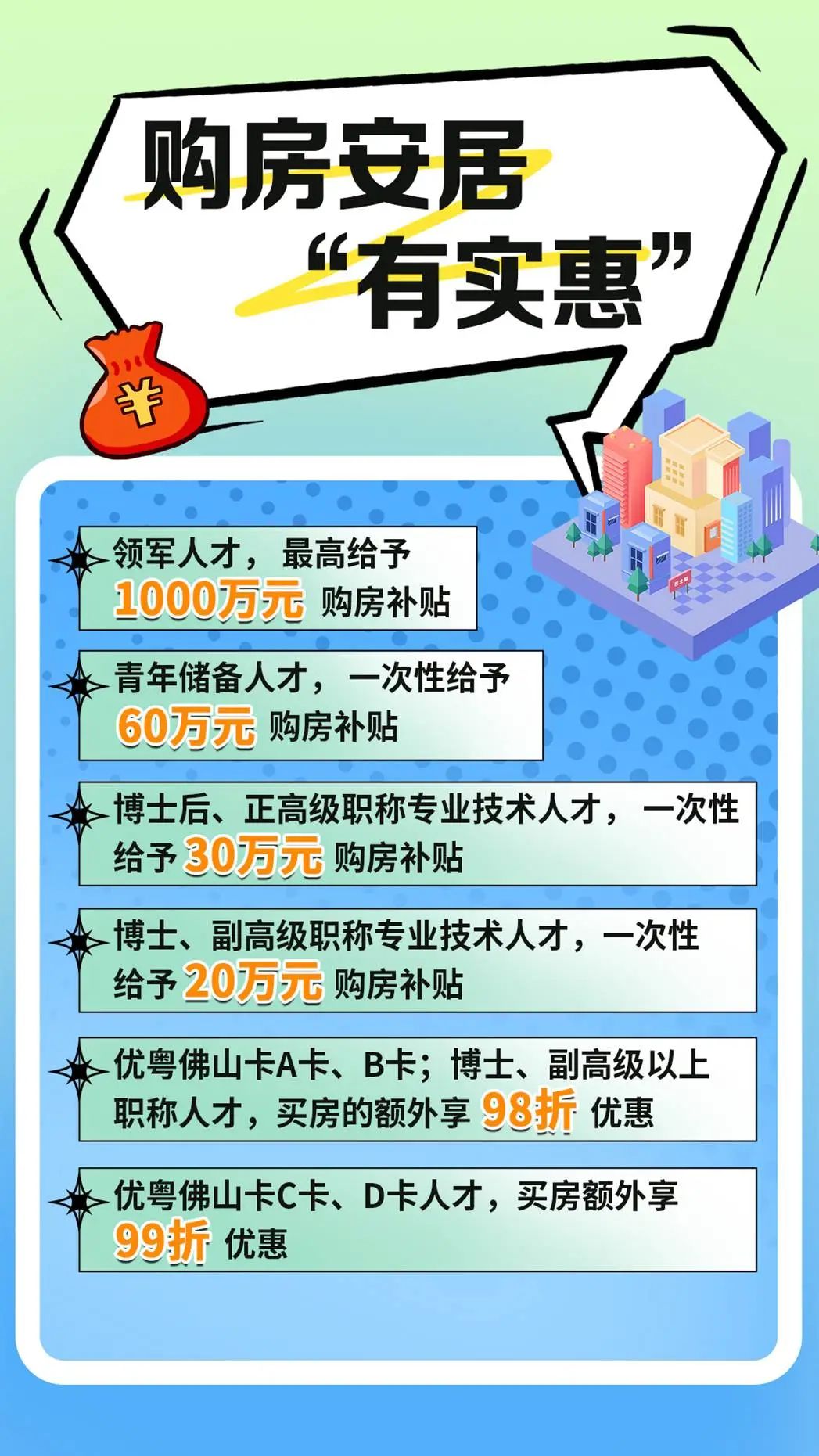 购房安居“有实惠”:对全职新引进到佛山工作,且引进后在佛山市购买商品住房的领军人才,最高给予1000万元购房补贴;对认定或获评青年储备人才的,一次性给予60万元购房补贴;对博士后、正高级职称专业技术人才,一次性给予30万元购房补贴;对博士、副高级职称专业技术人才,一次性给予20万元购房补贴。