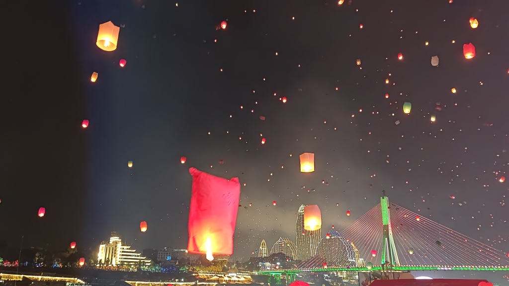 如果说传统龙舟表演赛和曼听御花园赶摆是对欢乐的完美诠释,那么14日晚上的万人齐放孔明灯活动,则是一场极致浪漫的视觉盛宴。